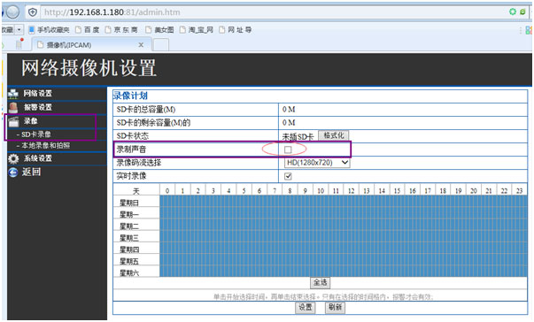 92H默认TF卡是不录声音的,需要录像声音要在局域网内IE浏览器里用IP打开进到设置里,录像》SD卡录像,录制声音那项勾选,如下图: